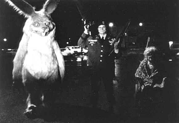 Bill and Ted get Satan's attention (he's voice by Frank Welker!), but he sends them into a prison-like area with numerous doors. The first door leads to a German Expressionist version of a military barracks where Colonel Oats forces the Stallyns to do infinity push-ups. They get away from him, but figure that if they split up, they won't get slapped with stuff that heinously harsh. They were wrong: Bill comes face-to-face with his ancient grandmother (who wants a kiss) and Ted runs into the thing he fears the most: the Easter Bunny!